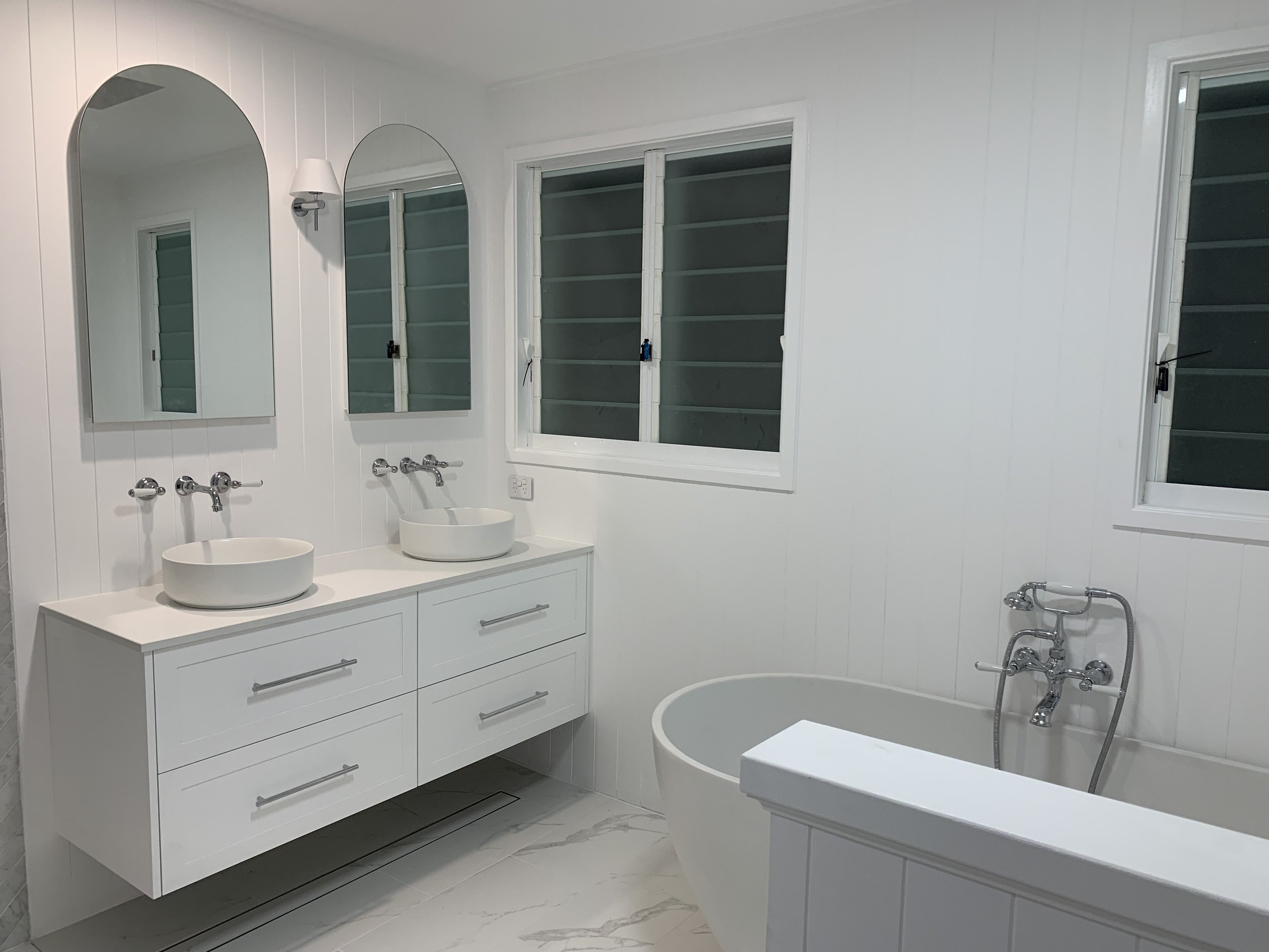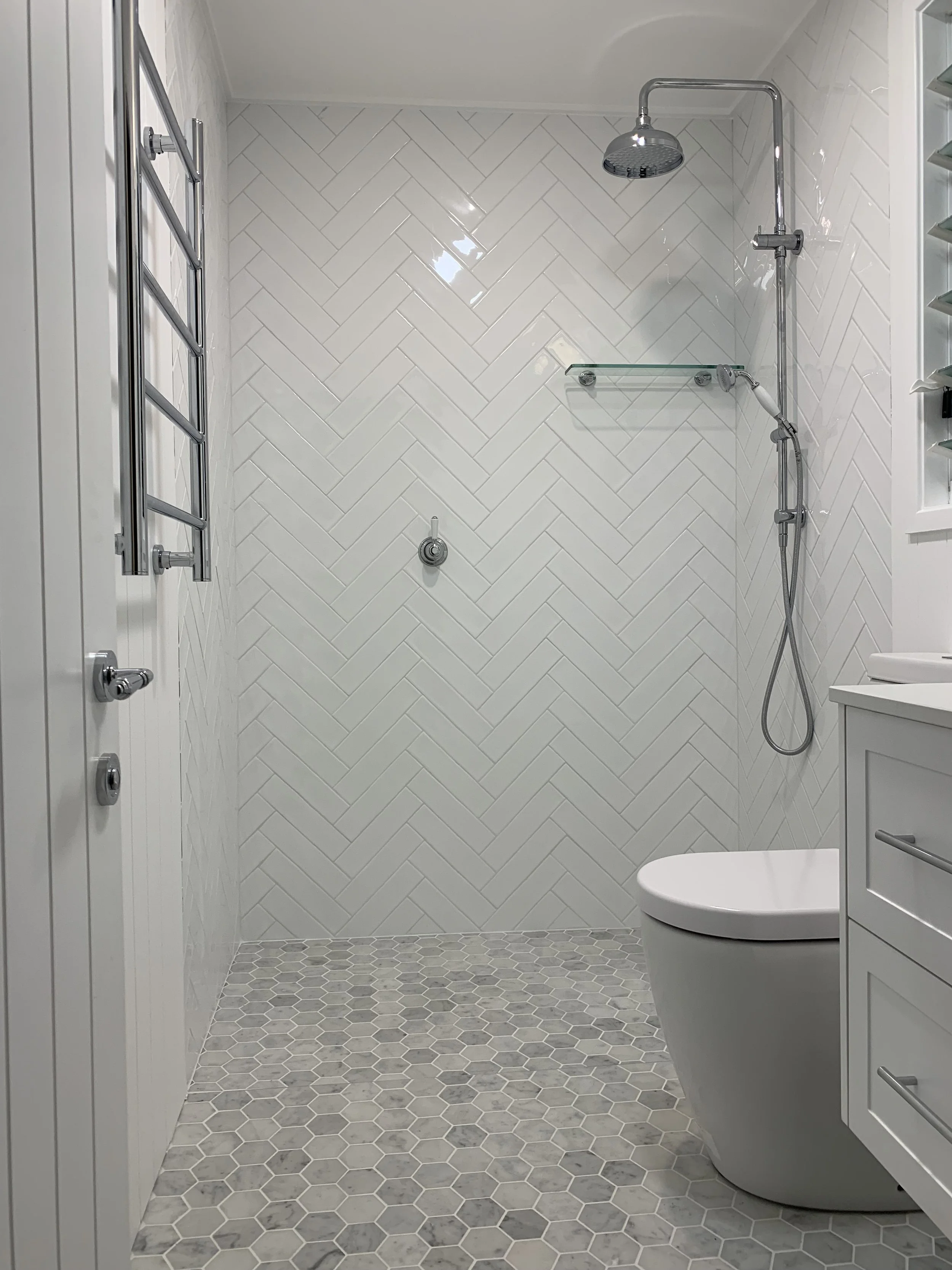 This second story bathroom and ensuite renovation was designed with classic natural terra marble tiles laid in herringbone formation throughout the wet areas, utilising a wonderful James Hardie cement v-groove sheet for the non-wet areas. Coupled with premium astra-walker fixtures, heated towel rails, wall hung vanities and recessed arch shaving cabinets.